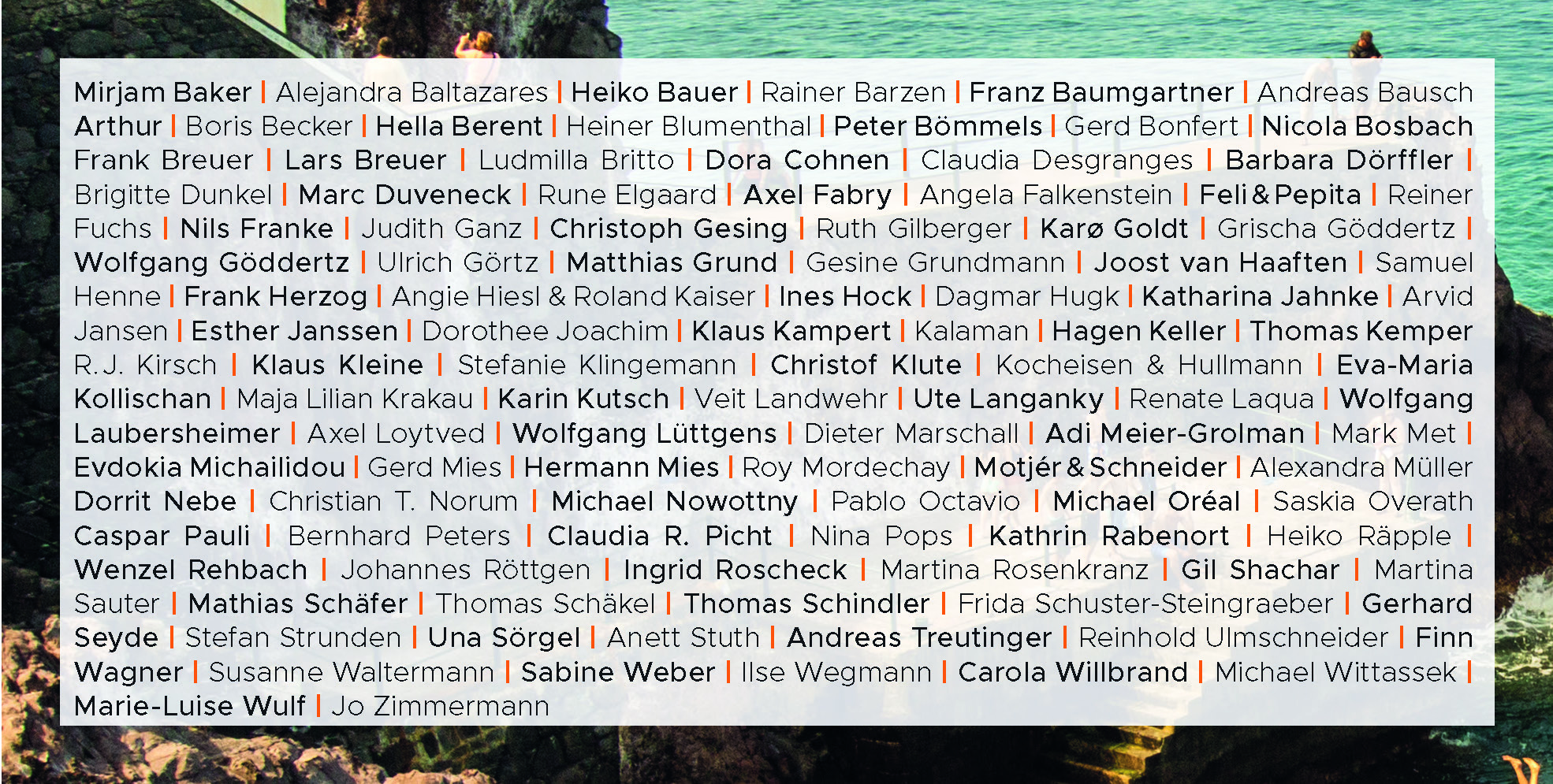 Anja Behrens · Oliver Braig · Albert Coers · Claudia Desgranges · Isabelle Dyckerhoff · Florian Ecker · Christian Frosch · Inge Gutbrod · Anja Güthoff · Zita Habarta · Zandra Harms · Reiner Heidorn · Thomas Hellinger · Angelika Hoegerl · Bettina Hutschek · Karen Irmer · Trisha Kanellopoulos · Anna Maria Kursawe · Elvira Lantenhammer · Florian Lechner · Katrin Leitner · Carolin Leyck · A. Paola Neumann · Ursula Oberhauser · Jürgen Paas · Marc Peschke · Christof Rehm · Gabriele Schade-Hasenberg · Katharina Schellenberger · Kirk Sora · Angela Stauber · Jaee Tee · Doris Titze · Maria Wallenstål-Schoenberg · Thomas Wunsch ·· MEISSEN Design ·· Kunst-Ratgeber